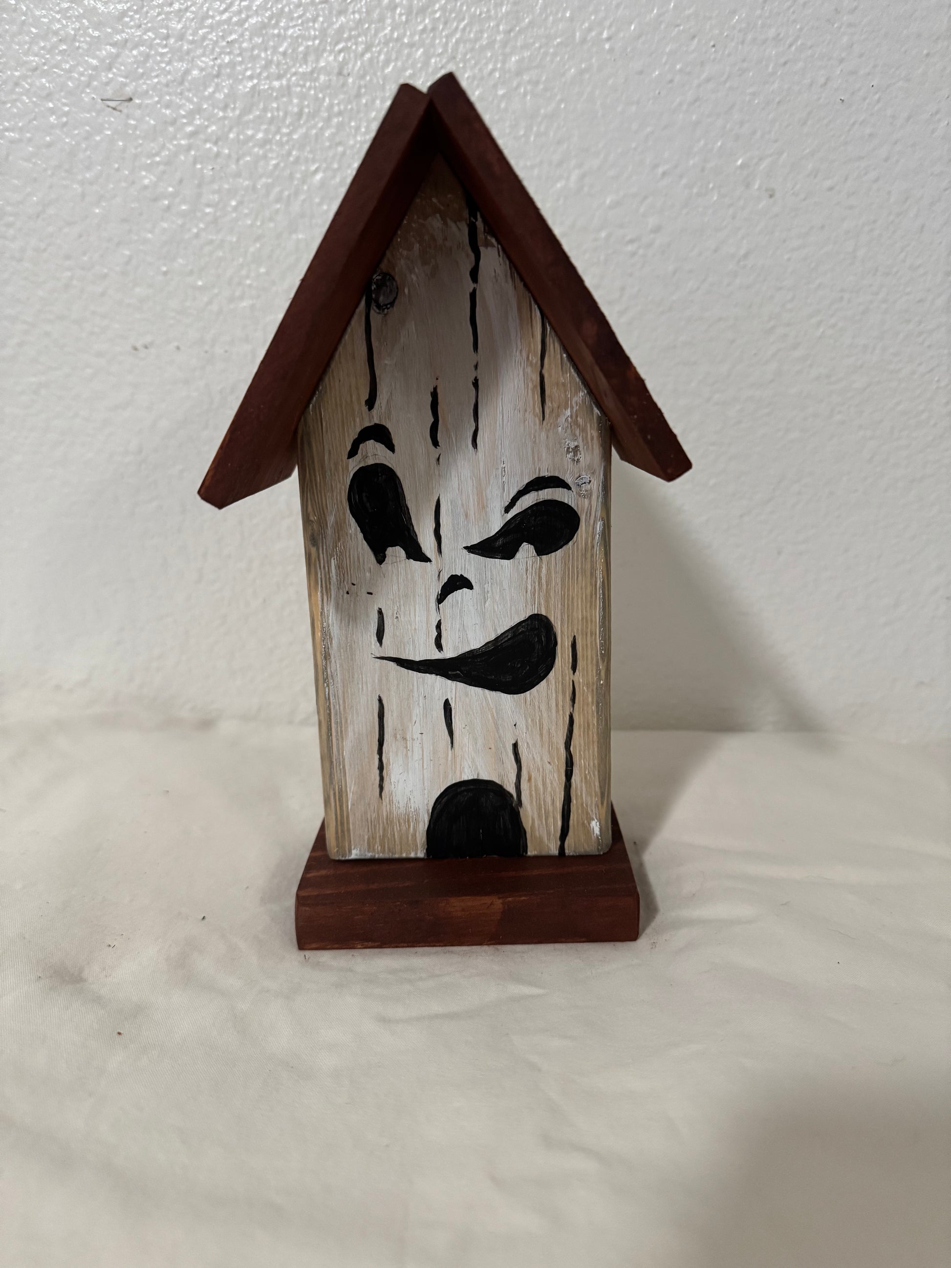 Perfect for your Halloween decor. These cute little guys are hand crafted out of cedar and pine and decorated, by hand, with a clever face. About 7 1/2" high, they fit on any shelf or table. Just keep in mind that since they are all painted, with a brush, by hand, there will be subtle differences between each example. But you can be sure that what we ship will be almost indistinguishable from the pics.
